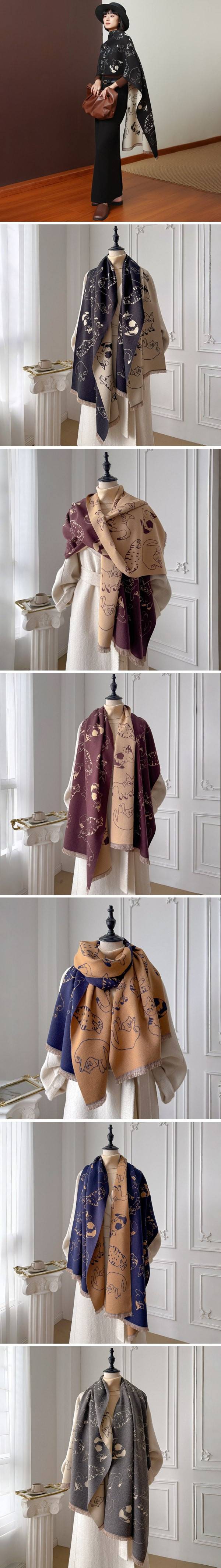 羊絨圍巾 貓咪插畫風雙面羊絨圍巾4色 韓國飾品 韓國耳環 耳環 髮飾 手鍊 戒指 純銀飾品 珍珠耳環 三麗鷗代購 飾品店