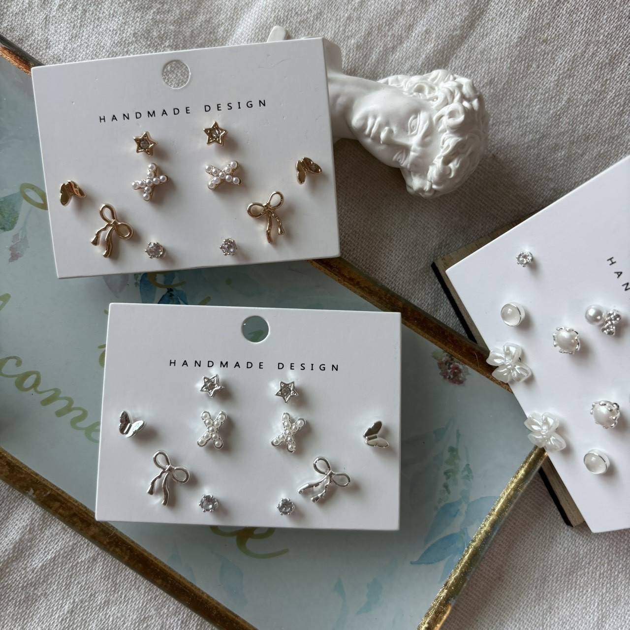 金屬蝴蝶結珍珠多組合耳環 韓國飾品 韓國耳環 耳環 髮飾 大腸圈 腸圈 手鍊 戒指 純銀飾品 珍珠耳環 三麗鷗代購 飾品店